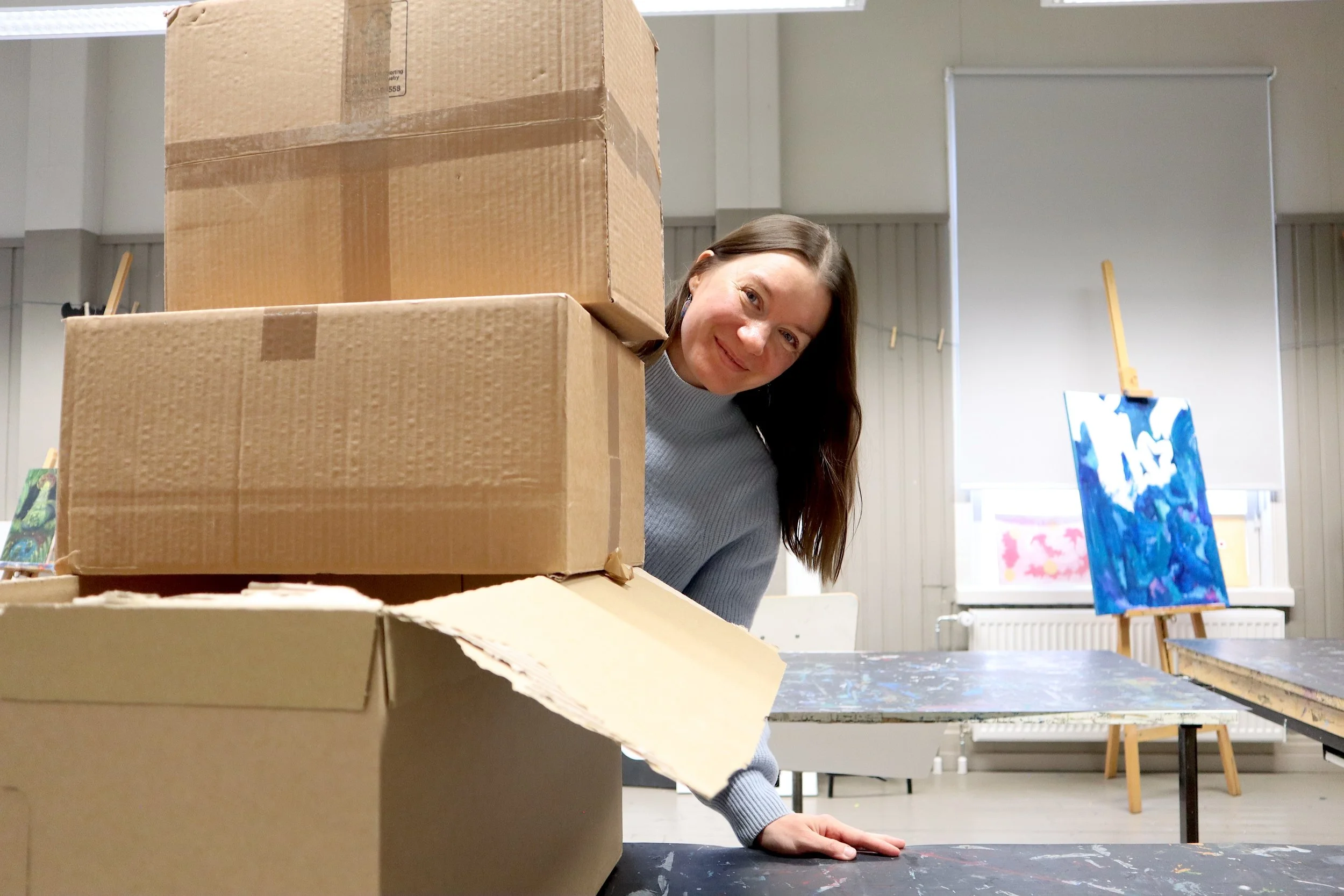 Tomma kartonger och annat återbrukat material kommer väl till pass både inom bildkonsten och arkitekturen, och speciellt när det gäller att skapa tredimensionellt, säger Julia Johansson.