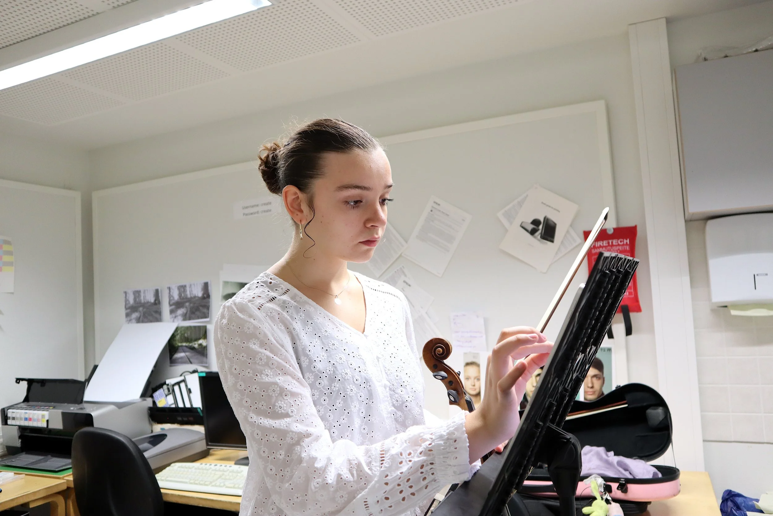 När lektionen är slut packar Senny ihop sina saker för att rusa vidare till nästa klassrum. Årets läger har tre olika orkestrar och hon spelar i alla.