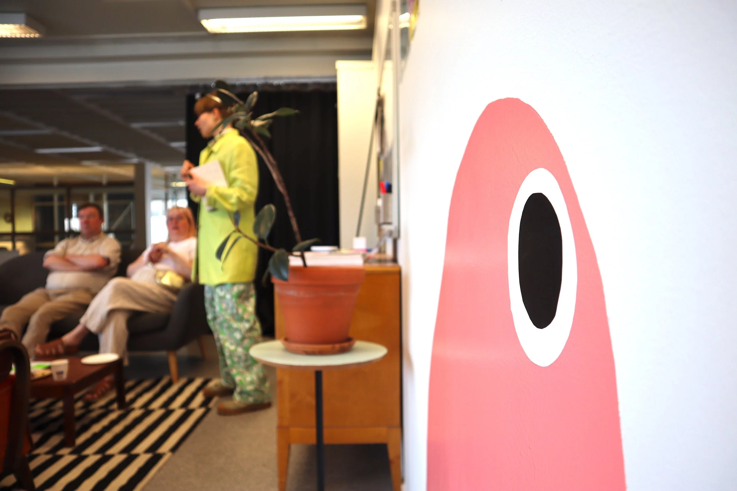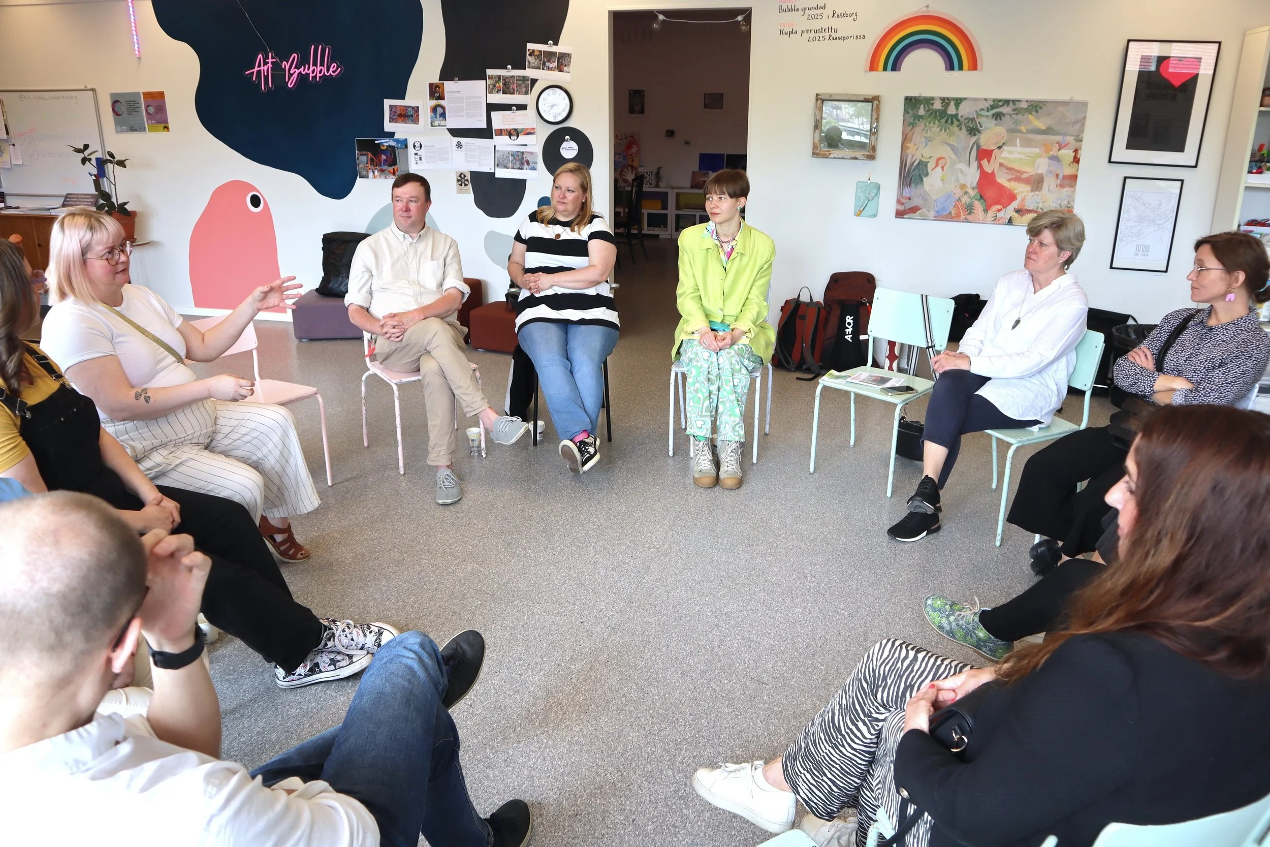 Vippe Leminen står med anteckningsblocket i högsta hugg. I en cirkel runt omkring sitter konstpedagoger, projektledare, lärare och forskare, och på väggen bakom lyser ett neonrosa väggord, Art Bubble. Ett av Kulturums uppdrag är att möjliggöra nätverkande och skapa mötesplatser. Sommarträffen som ordnas i Konstbubblans utrymmen i Karis har lockat ett tiotal deltagare som tillsammans funderar på utmaningar, delar med sig av goda råd och unnar sig en hel dag av kultursnack.
